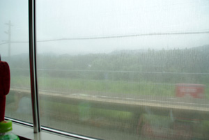 トンネルを抜けたと途端、湿度差によってガラスが一気に曇ります。しかも外は雨。