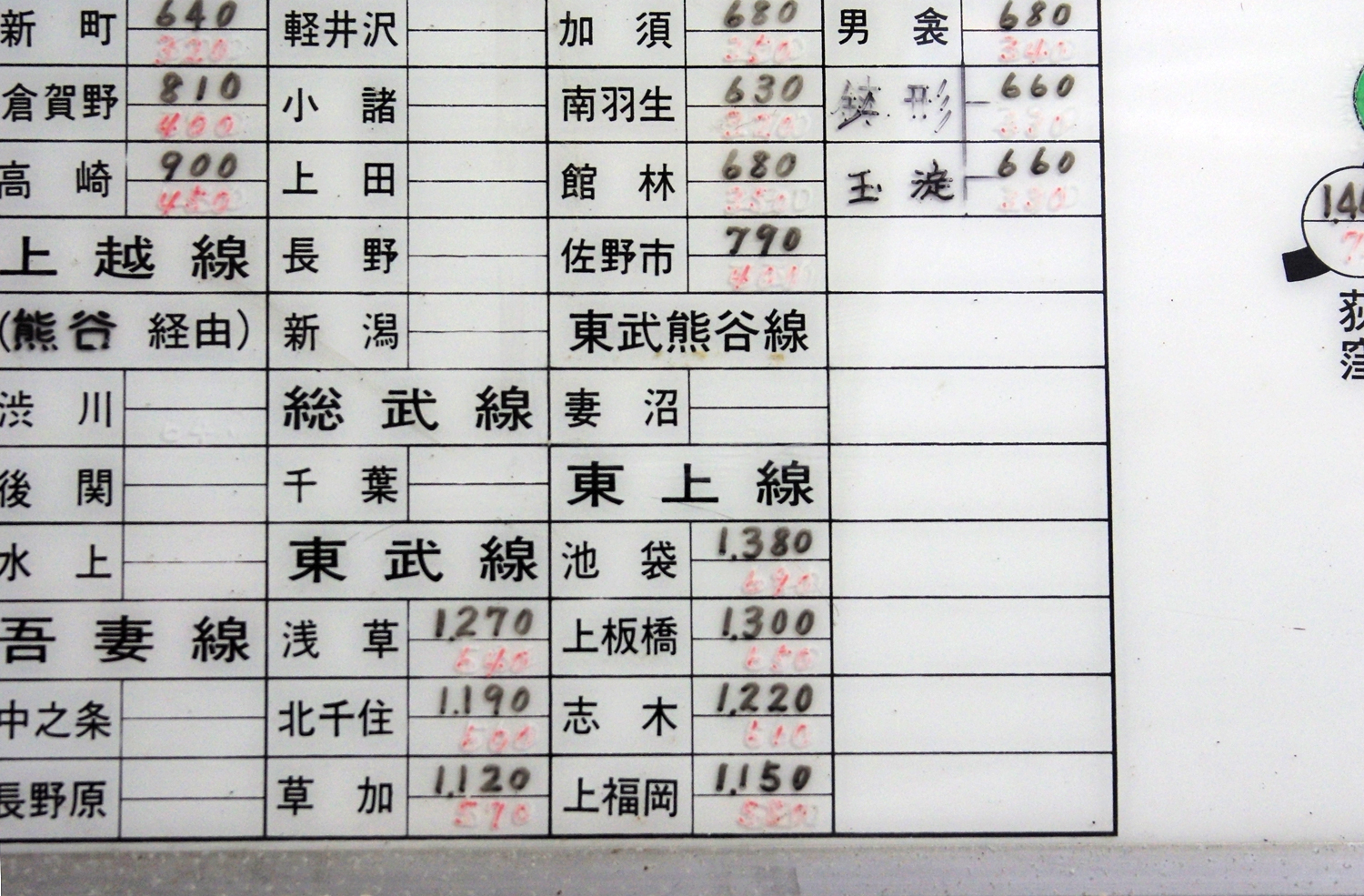 上熊谷駅の運賃表。