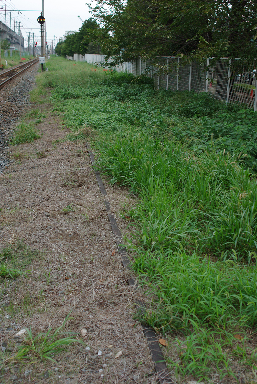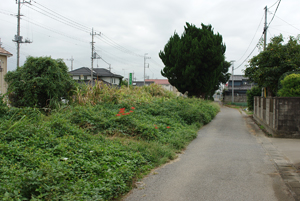 妻沼駅跡地手前の盛り土。この辺りがホームだったと思うのですが、奥のデカい木には何となく見覚えがあります。