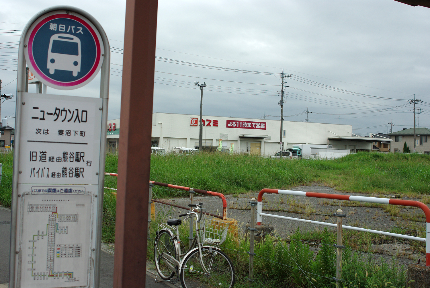 妻沼駅跡地。現在は熊谷からのバス停留所があります。駅舎跡は更地になり、当時を偲ばせる物は下地のコンクリートのみです。