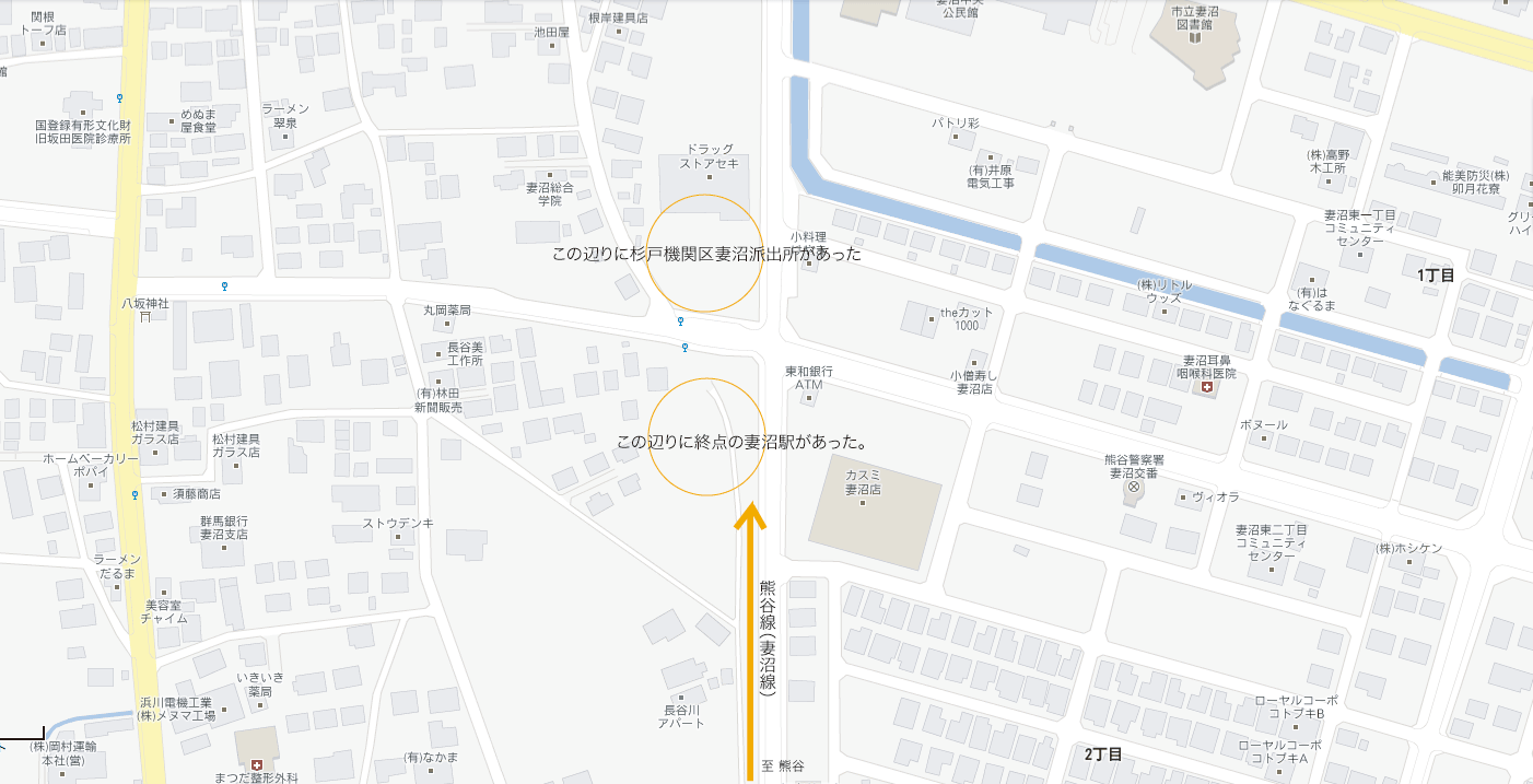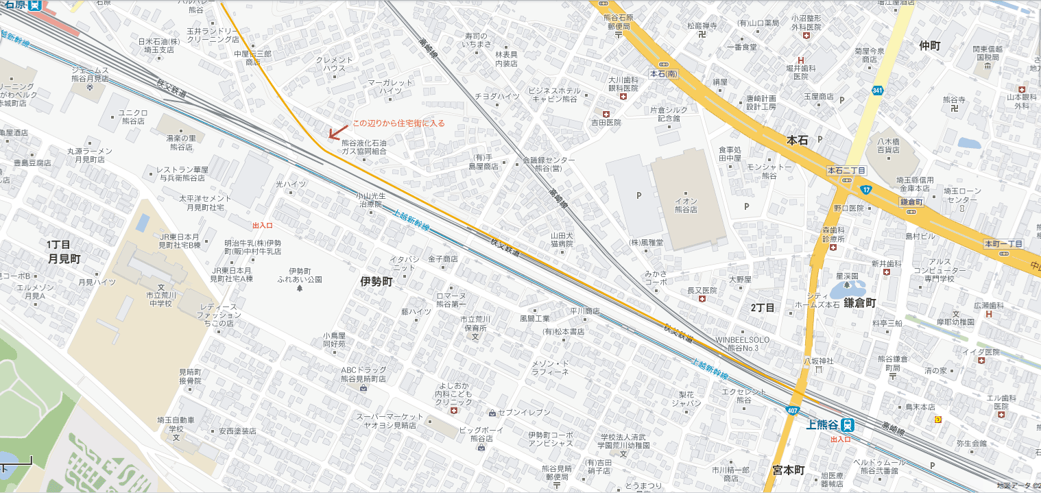 現在の上熊谷駅周辺地図。オレンジ色のラインが熊谷線跡です。
