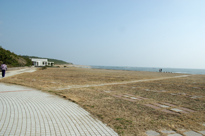 海岸まではキャベツ畑の脇をテクテクと歩きます。前方の防風林を過ぎれば海岸です。