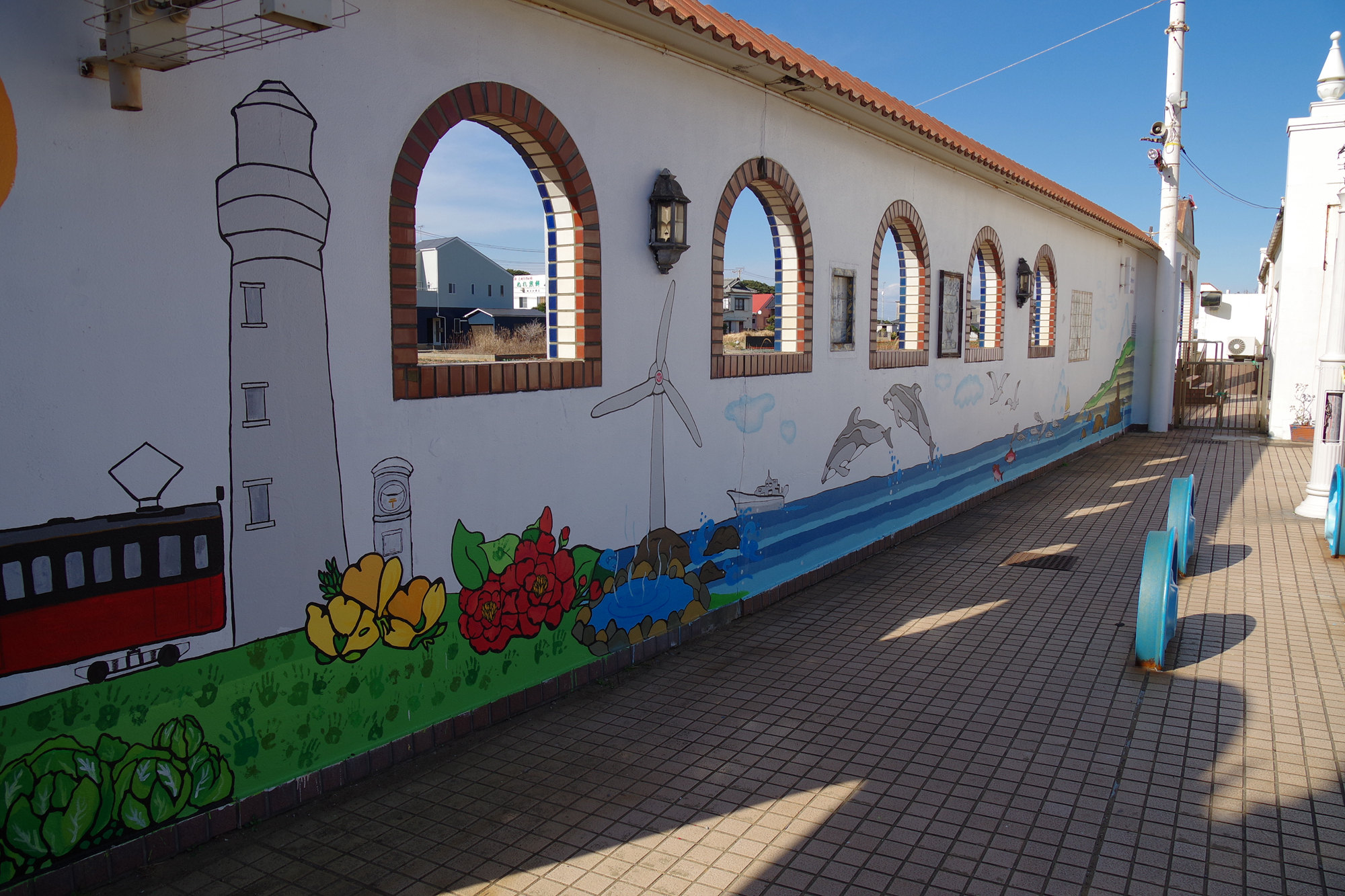 駅の塀が鮮やかなイラストで飾られました。とてもポップで良い感じです。