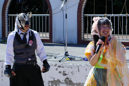 「銚子元気娘」の今ちーねさん。イベント司会のレオパルドンの哀愁さんと。