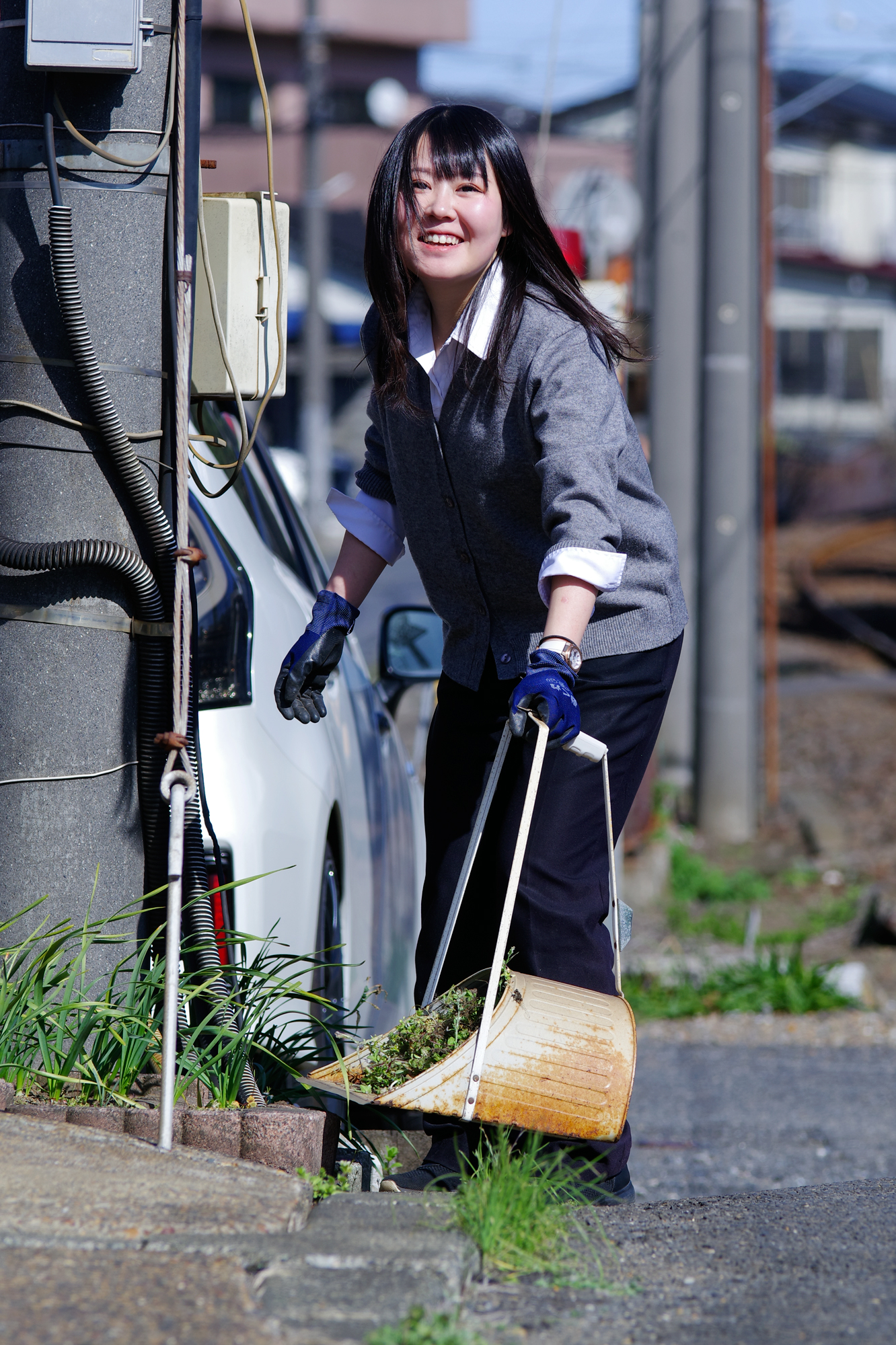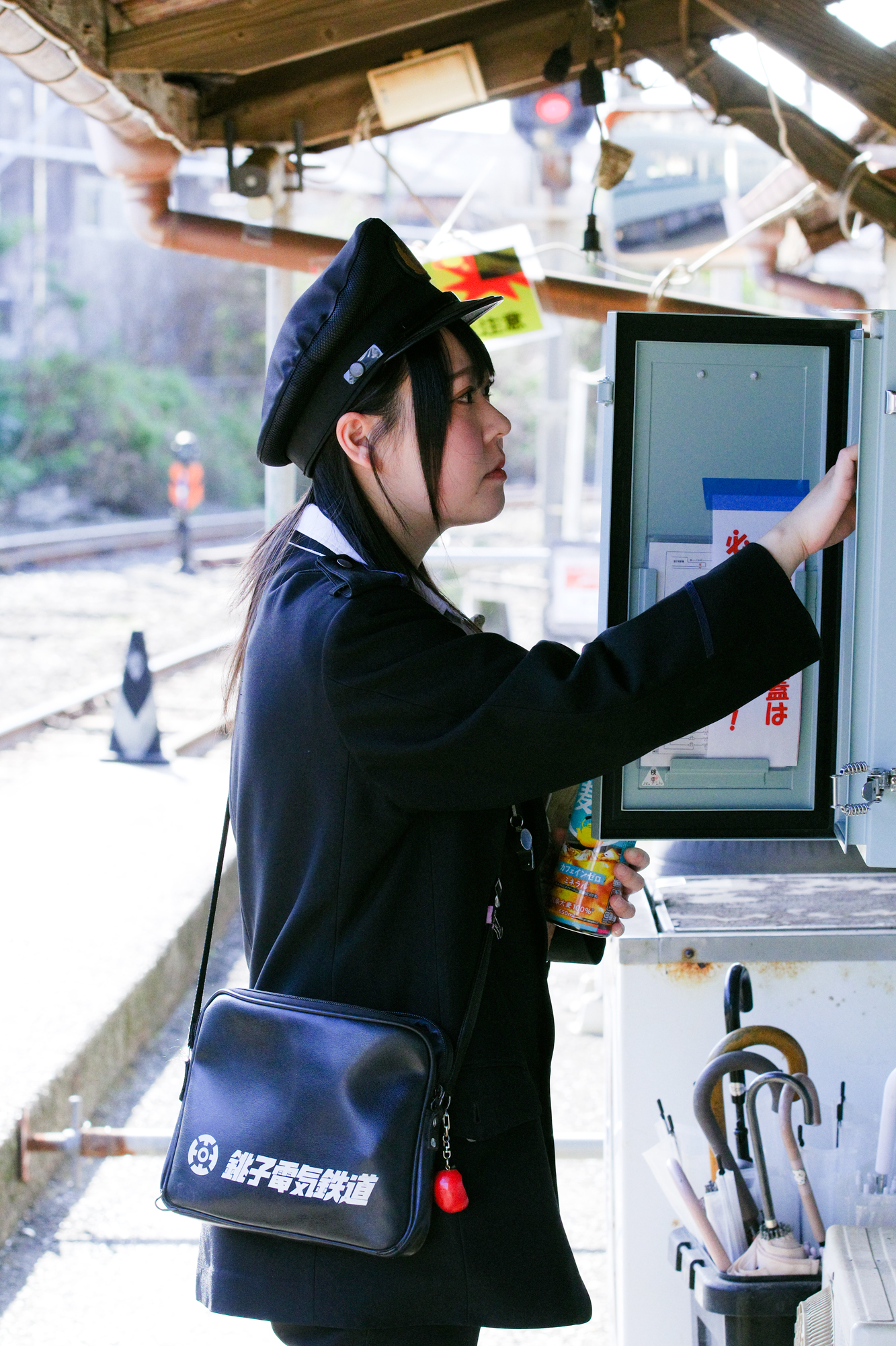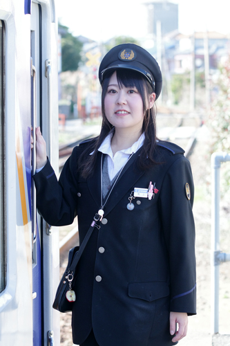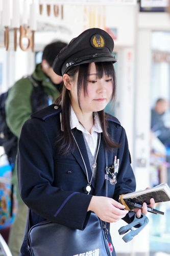 午後の陽射しで背景は明るく、車両の影はやや暗く、制服の黒も露出に加味すると厳しい撮影条件です。