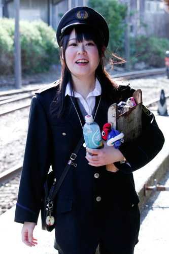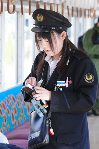 銚子駅車内にてお客様対応中。